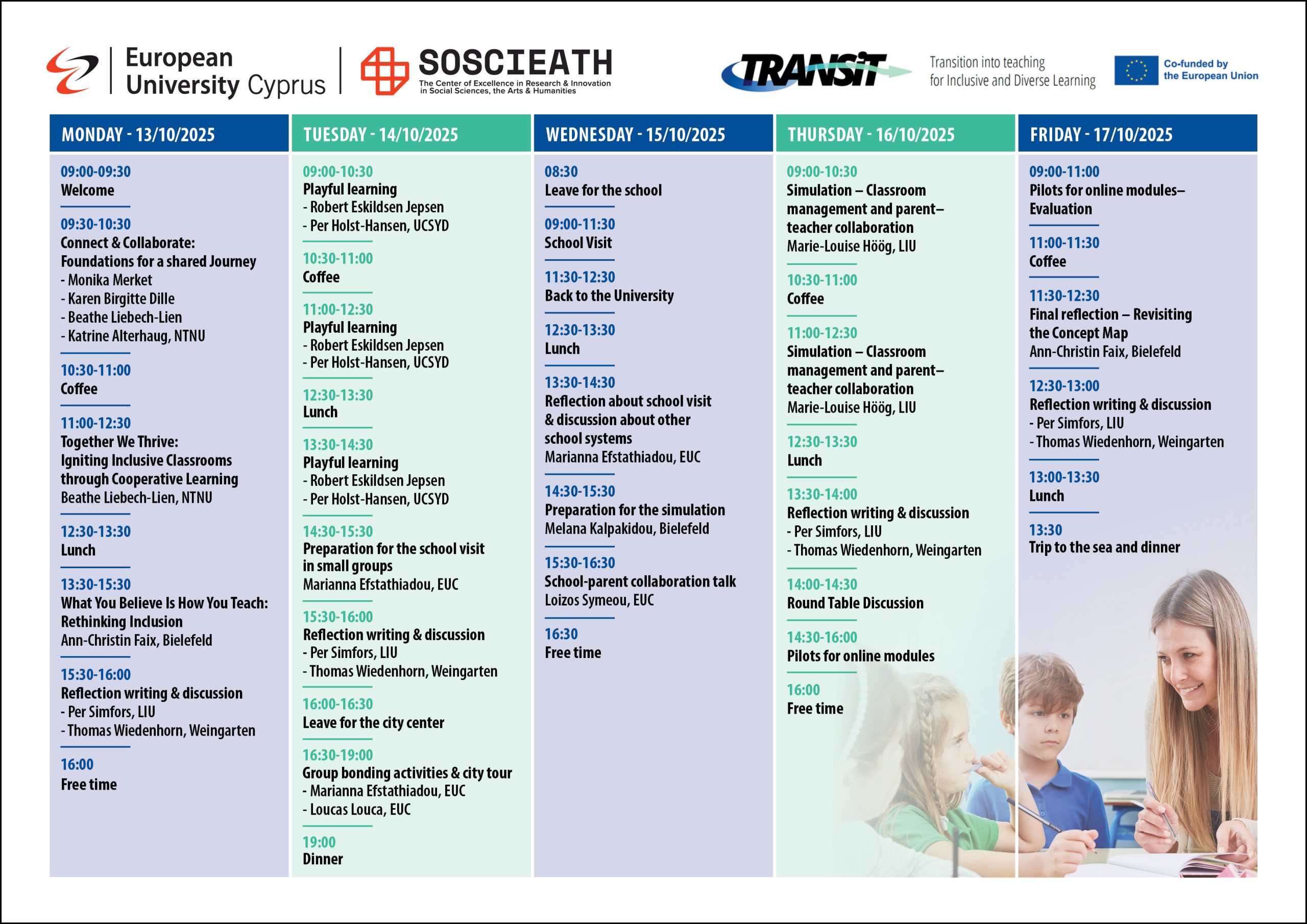 🇬🇧 The TRANSIT Project: Transition into Teaching for Inclusive and Diverse Learning, is organizing an Intensive Training Program during the week of October 13–17 at the European University Cyprus.