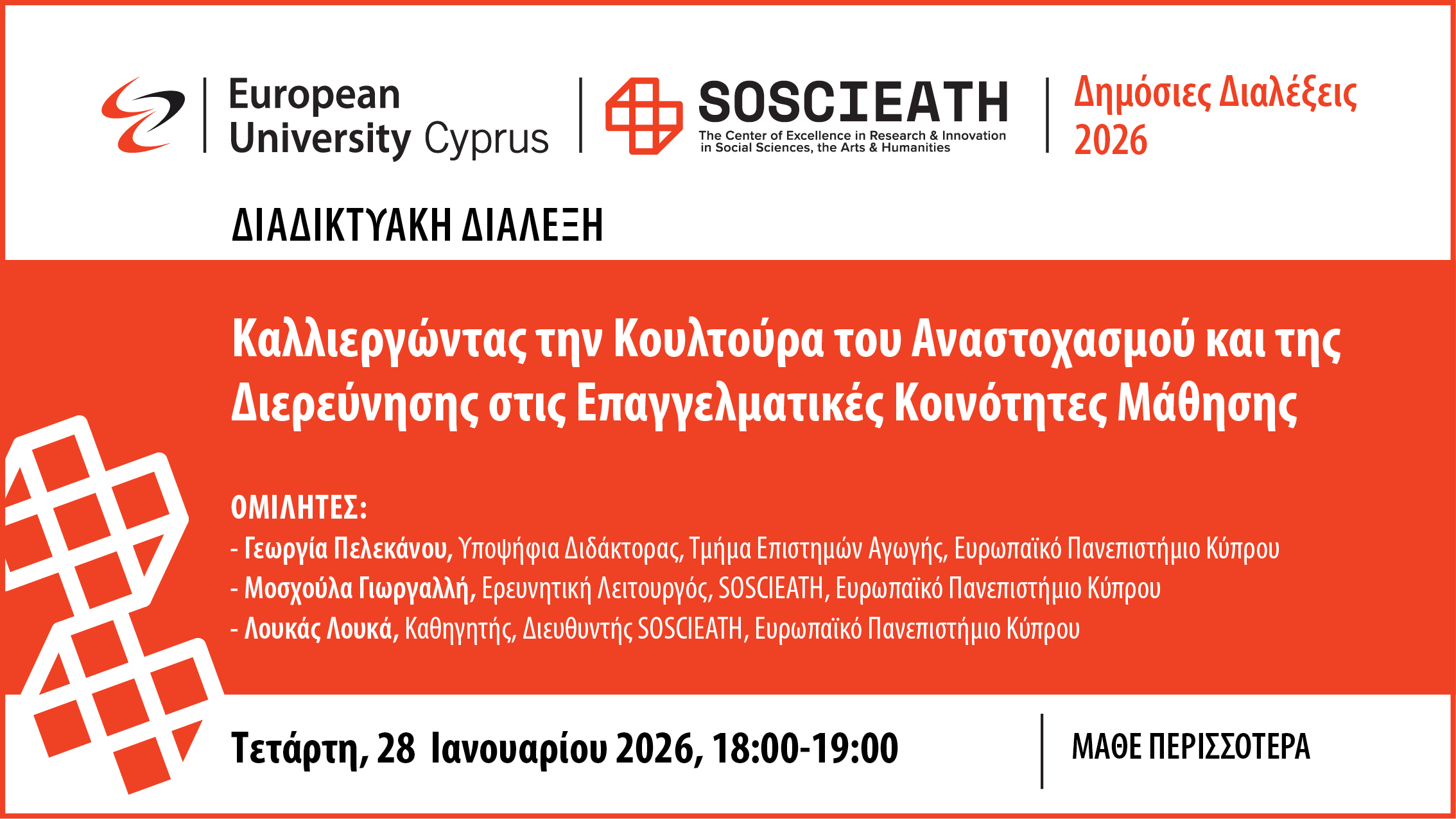 Το Ευρωπαϊκό Πανεπιστήμιο Κύπρου και το Κέντρο Αριστείας για την Έρευνα και Καινοτομία στις Κοινωνικές Επιστήμες, τις Τέχνες και τις Ανθρωπιστικές Επιστήμες SOSCIEATH σας προσκαλεί στη δεύτερη διαδικτυακή δημόσια διάλεξη της χρονιάς με θέμα: