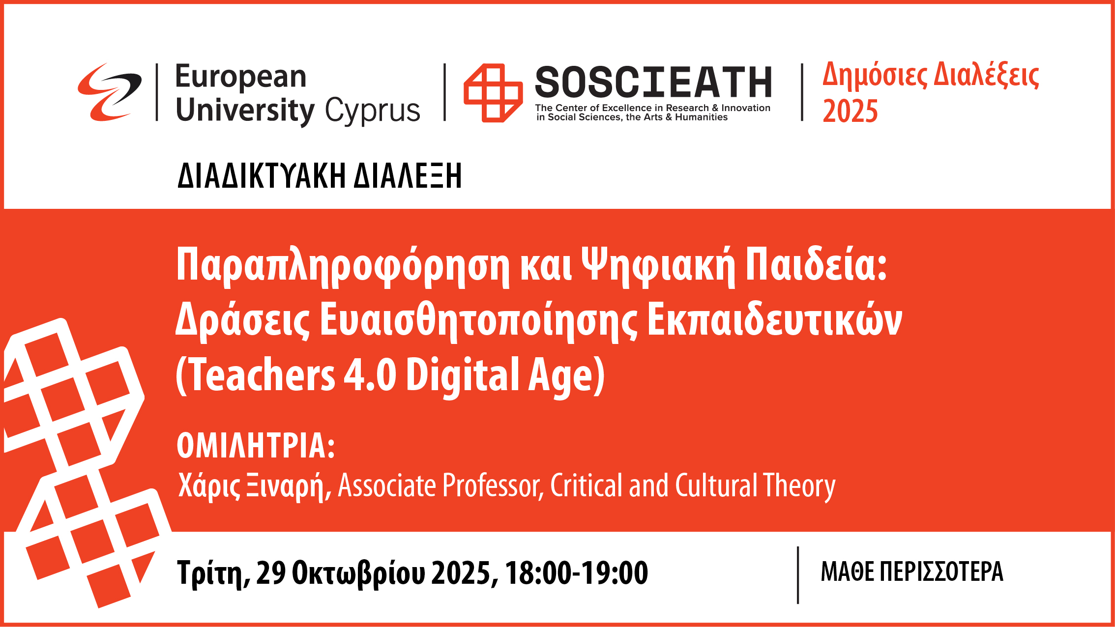 Το Ευρωπαϊκό Πανεπιστήμιο Κύπρου και το Κέντρο Αριστείας για την Έρευνα και Καινοτομία στις Κοινωνικές Επιστήμες, τις Τέχνες και τις Ανθρωπιστικές Επιστήμες SOSCIEATH σας προσκαλεί στην έκτη διαδικτυακή δημόσια διάλεξη της χρονιάς με θέμα: Παραπληροφόρηση και Ψηφιακή Παιδεία: Δράσεις ευαισθητοποίησης εκπαιδευτικών (Teachers 4.0 Digital Age) Περιγραφή: Η παραπληροφόρηση αποτελεί ένα σοβαρό κοινωνικό ζήτημα που επηρεάζει την αντίληψη των...Read More