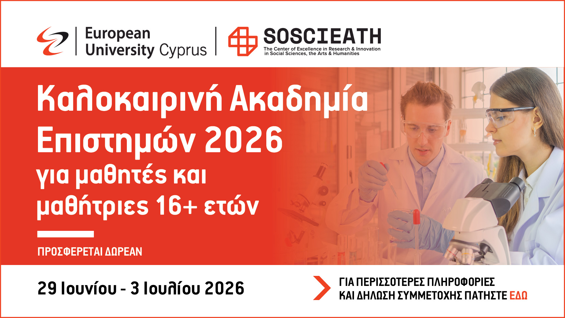Καλοκαιρινή Ακαδημία Επιστημών 2026 Για τέταρτη χρονιά, το Κέντρο Αριστείας για την Έρευνα & Καινοτομία στις Κοινωνικές Επιστήμες, τις Τέχνες και τις Ανθρωπιστικές Επιστήμες (SOSCIEATH) του Ευρωπαϊκού Πανεπιστημίου Κύπρου ανακοινώνει την έναρξη εγγραφών για την Καλοκαιρινή Ακαδημία Επιστημών 2026 για μαθητές και μαθήτριες Λυκείου 16+ ετών. Η Καλοκαιρινή Ακαδημία Επιστημών 2026 προσφέρεται ΔΩΡΕΑΝ και θα πραγματοποιηθεί 29 Ιουνίου...Read More