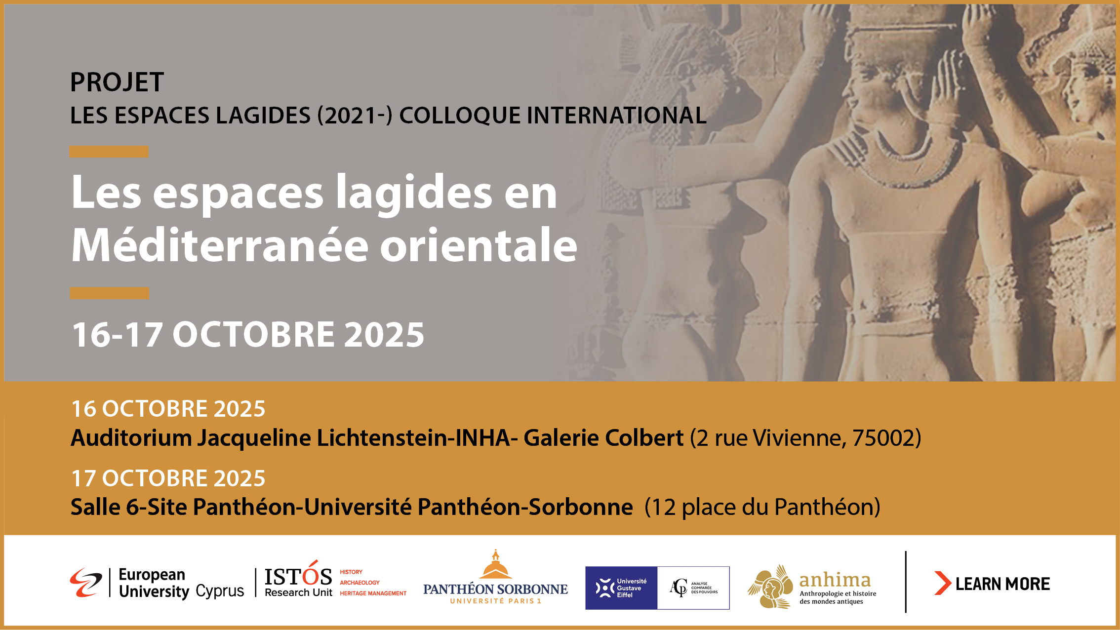 Within the framework of the Les Espaces Lagides project (2021–), this conference examines the mechanisms of power, royal ideology, and cultural dynamics in Ptolemaic territories (Cyprus, Cyrenaica, Southern Syria, Egypt) during the Hellenistic period. Held at the INHA (16 October) and the Sorbonne (17 October), it brings together international scholars to critically assess the concept of “external possessions”—a term often used to describe non-Egyptian territories under Ptolemaic rule—while revealing the complex relationships between these regions and the Egyptian core of the empire.