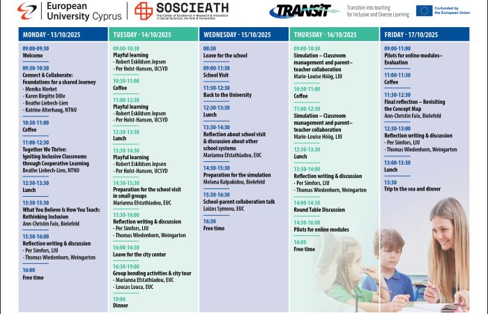 TRANSIT has 3 main target groups: student teachers, early career teachers and teacher educators. The aim is to reach approx. 120 during project period and many more after project end through ongoing and sustainable dissemination activities. Cooperative learning will be used as theoretical and methodological foundation for training activities and workshops. These activities will be complemented by theoretical reviews and design of learning units to support school teachers’ competence development.